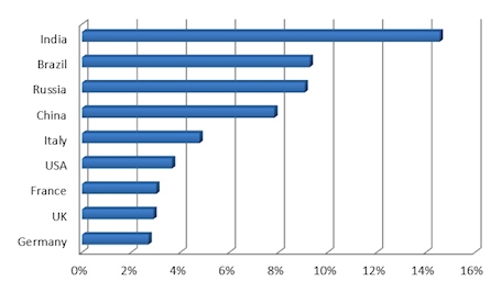 India has the highest CAGR (Compound Annual Growth Rate) at 15%, followed by Brazil and Russia on 9%.