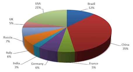 China has by far the largest share of the world market which is estimated at 10.94 US$ billion.