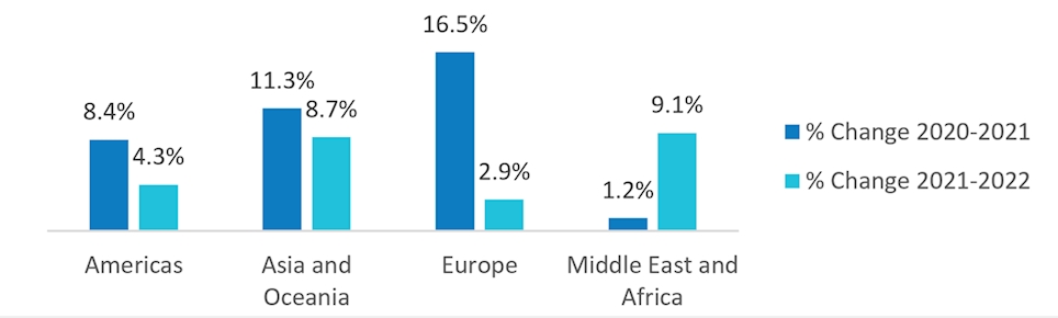 Europe – In France, the chiller market was supported by subsidies. The proportion of screw chillers used in process applications and data centres is estimated to be over 75%. The Spanish chiller market returned to growth in 2021, after suffering steep losses in the previous year. In Germany, the chiller market in 2021 began recovering in most segments but did not return to the sales level of 2019. Most chillers are for comfort cooling; the rest are used in process cooling.