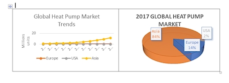 In 2017 the volume of units sold worldwide also jumped 32 per cent to over 4.5 million compared to 2016. Asia remains the largest world region in terms of heat pumps sales, driving 84 per cent of the total sales volume.