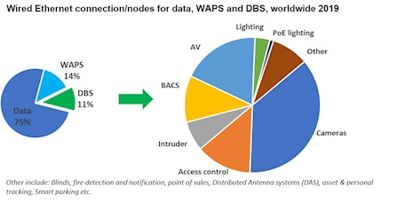 There were an estimated 154 million Ethernet connections/ports worldwide in 2019. The majority of these are supporting data (and voice), but a significant number are connected to wireless access points (WAPs) and Distributed Building Services (DBS). The key products included under Distributed Building Services are surveillance cameras, audio/video, access controls and building automation controllers.