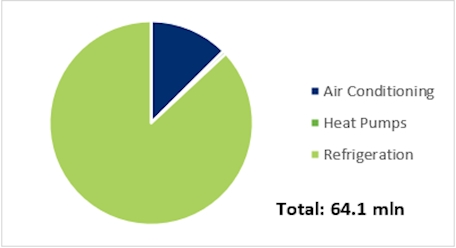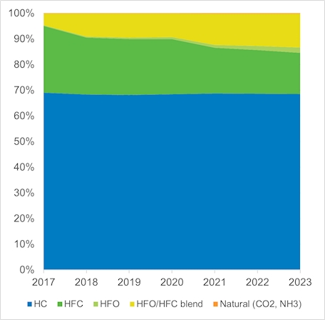 While the majority of the domestic HP market are still using R410A, there are more initiatives toward using propane in outdoor units for HP than in AC. In addition, the use of R1234ze in large screw units, with its large temperature range, allows for a growth in the market for commercial heat pumps.
