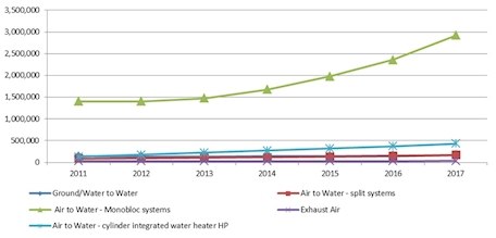 Analysis of the 14 countries researched in 2013 provides a full understanding of the market. It covers ground and water-to-water, air-to-water, exhaust air and cylinder-integrated units. Additional research has been undertaken to cover the forced air heat pump market typical in the USA.