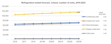 Refrigeration accounts for the main source of energy use in food retail. The market for condensing units is estimated at some 68,000 units in 2019. In the last three years, growth of sales in value was higher than in volume, as average prices increased due to the uptake of R134a in medium temperature applications. Growth in value is expected to remain higher, due mainly to the technical evolutions experienced in this product segment and the subsequent rise in prices of products. There is also an increase in the supply of CO2 condensing units, which will drive further this rise in the prices of products.