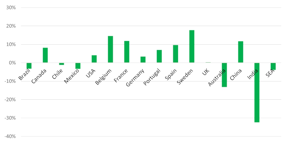 Overall, the global structured cabling market declined by 10% in 2020 measured in USD. The worst-hit markets were India and Brazil, followed closely by Canada. Many countries experienced decreases of 10-15% and only a few such as China, Sweden, Portugal, Belgium, and Germany did reasonably well.