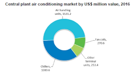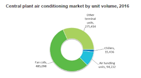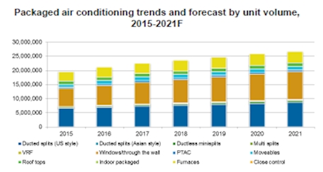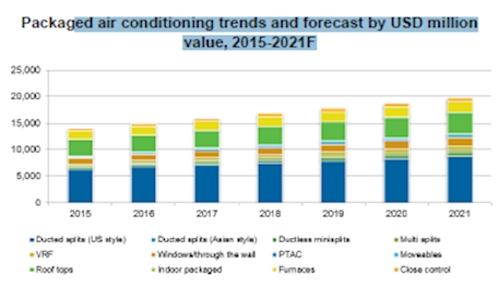There was a slight drop in the volume of rooftop units, while VRF grew strongly compared to the previous year. The market for packaged air conditioning was valued at US$17 billion in 2016.