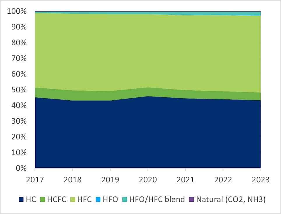 Screw compressors are largely used above a threshold of 250-300 kW, in both AC and REF applications. Centrifugal oil-free compressors compete with screw but their use is more limited, due to their cost premium. Screw is expected to be a dynamic market with sales progressing steadily up until 2023, encouraged by the implementation of inverter technology. Oil free centrifugal compressors are expected to gain market share in AC and heat pumps, while standard centrifugal remain consistent.